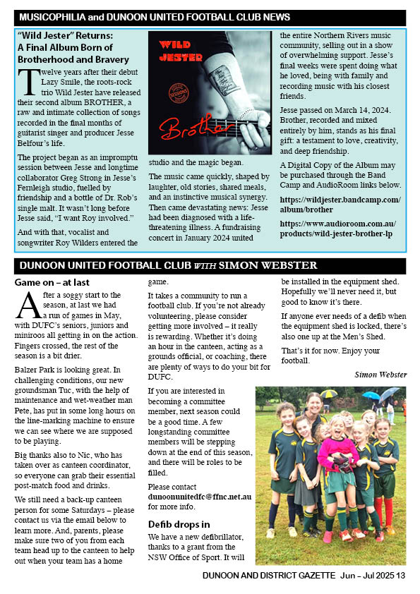 We have a moving tribute to Jesse Belfour with Wild Jester’s album “Brother”. Read more on page 13 and buy your digital copy of Jesse’s final album using the links provided.